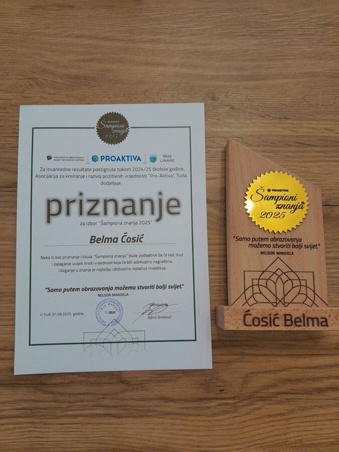 Naša učenica Belma Ćosić je danas primila priznanje u okviru projekta "Šampioni znanja 2025".